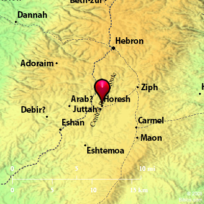 Atlas ![]() Horesh and surrounding area Maps Created using Biblemapper 3.0 Additional data from OpenBible.info You are free to use up to 50 Biblos coprighted maps (small or large) for your website or presentation. Please credit Biblos.com. Occurrences 1 Samuel 23:15 David saw that Saul had come out to seek his life. David was in the wilderness of Ziph in the wood.1 Samuel 23:16 Jonathan, Saul's son, arose, and went to David into the woods, and strengthened his hand in God. 1 Samuel 23:18 They both made a covenant before Yahweh: and David stayed in the woods, and Jonathan went to his house. 1 Samuel 23:19 Then the Ziphites came up to Saul to Gibeah, saying, "Doesn't David hide himself with us in the strongholds in the wood, in the hill of Hachilah, which is on the south of the desert? Encyclopedia HORESHho'-resh (choreshah, 1 Samuel 23:15, 18, margin only; Septuagint en Te Kaine, "in the New"; English Versions of the Bible "in the wood" (ba-choreshdh), the particle "in" being combined with the article): Choresh in other passages is translated "forest" (compare 2 Chronicles 27:4 Isaiah 17:9 Ezekiel 31:3) and it is most probable that it should be so translated here. Strong's Hebrew H2793: choreshwood, wooded height |