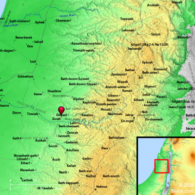 Atlas ![]() Zorah and surrounding region Maps Created using Biblemapper 3.0 Additional data from OpenBible.info You are free to use up to 50 Biblos coprighted maps (small or large) for your website or presentation. Please credit Biblos.com. Occurrences Joshua 15:33 In the lowland, Eshtaol, Zorah, Ashnah,Joshua 19:41 The border of their inheritance was Zorah, Eshtaol, Irshemesh, Judges 13:2 There was a certain man of Zorah, of the family of the Danites, whose name was Manoah; and his wife was barren, and didn't bear. Judges 13:25 The Spirit of Yahweh began to move him in Mahaneh Dan, between Zorah and Eshtaol. Judges 16:31 Then his brothers and all the house of his father came down, and took him, and brought him up, and buried him between Zorah and Eshtaol in the burial site of Manoah his father. He judged Israel twenty years. Judges 18:2 The children of Dan sent of their family five men from their whole number, men of valor, from Zorah, and from Eshtaol, to spy out the land, and to search it; and they said to them, "Go, explore the land!" They came to the hill country of Ephraim, to the house of Micah, and lodged there. Judges 18:8 They came to their brothers to Zorah and Eshtaol: and their brothers said to them, "What do you say?" Judges 18:11 There set forth from there of the family of the Danites, out of Zorah and out of Eshtaol, six hundred men girt with weapons of war. 2 Chronicles 11:10 and Zorah, and Aijalon, and Hebron, which are in Judah and in Benjamin, fortified cities. Nehemiah 11:29 and in En Rimmon, and in Zorah, and in Jarmuth, Encyclopedia ZORAHzo'-ra (tsor`ah; Saraa): A city on the border of Dan, between Eshtaol and Ir-shemesh (Joshua 19:41); the birthplace of Samson (Judges 13:2, 25); near here too he was buried (Judges 16:31); from here some Danites went to spy out the land (Judges 18:2, 11). In Joshua 15:33 it is, with Eshtaol, allotted to Judah, and after the captivity it was reinhabited by the "children of Judah" (Nehemiah 11:29, the King James Version "Zareah"). It was one of the cities fortified by Rehoboam (2 Chronicles 11:10). It is probable that it is mentioned under the name Tsarkha along with Aialuna (Aijalon; 2 Chronicles 11:10) in the Tell el-Amarna Letters(No. 265, Petrie) as attacked by the Khabiri. ZORAH, or Zore'ah and Za'reah, now called Surah, 13 ms. w. of Jerusalem. It is a village on the top of a hill, 1170 ft. above the Mediterranean, overlooking the valley of Sorek. Josh. 19; 41, Judg. 13:2, 25, 16:31, 18:2, etc. Strong's Hebrew H6881: Tsoraha city exchanged by Judah and Dan |